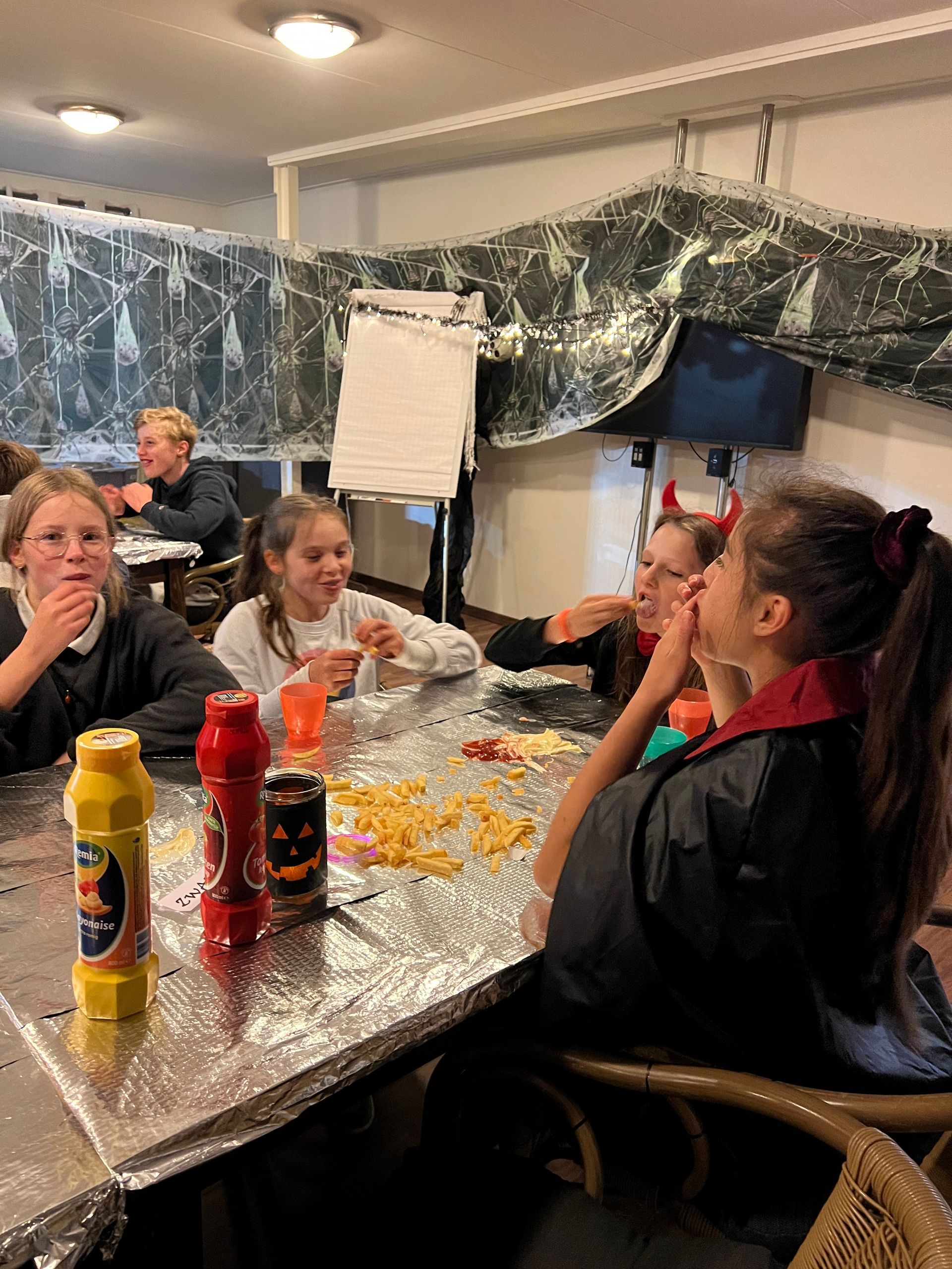 Na al dat sportieve geweld was het tijd voor een welverdiende pauze. Op de tafels verschenen dampende patatjes met klodders mayo en ketchup, gevolgd met een knetterijsjes toe. De perfecte brandstof voor de avonturen die nog zouden komen.