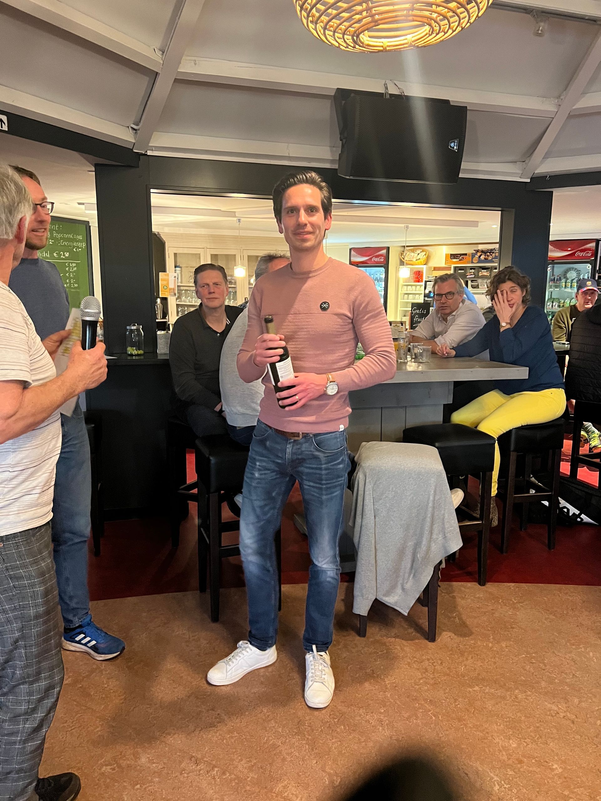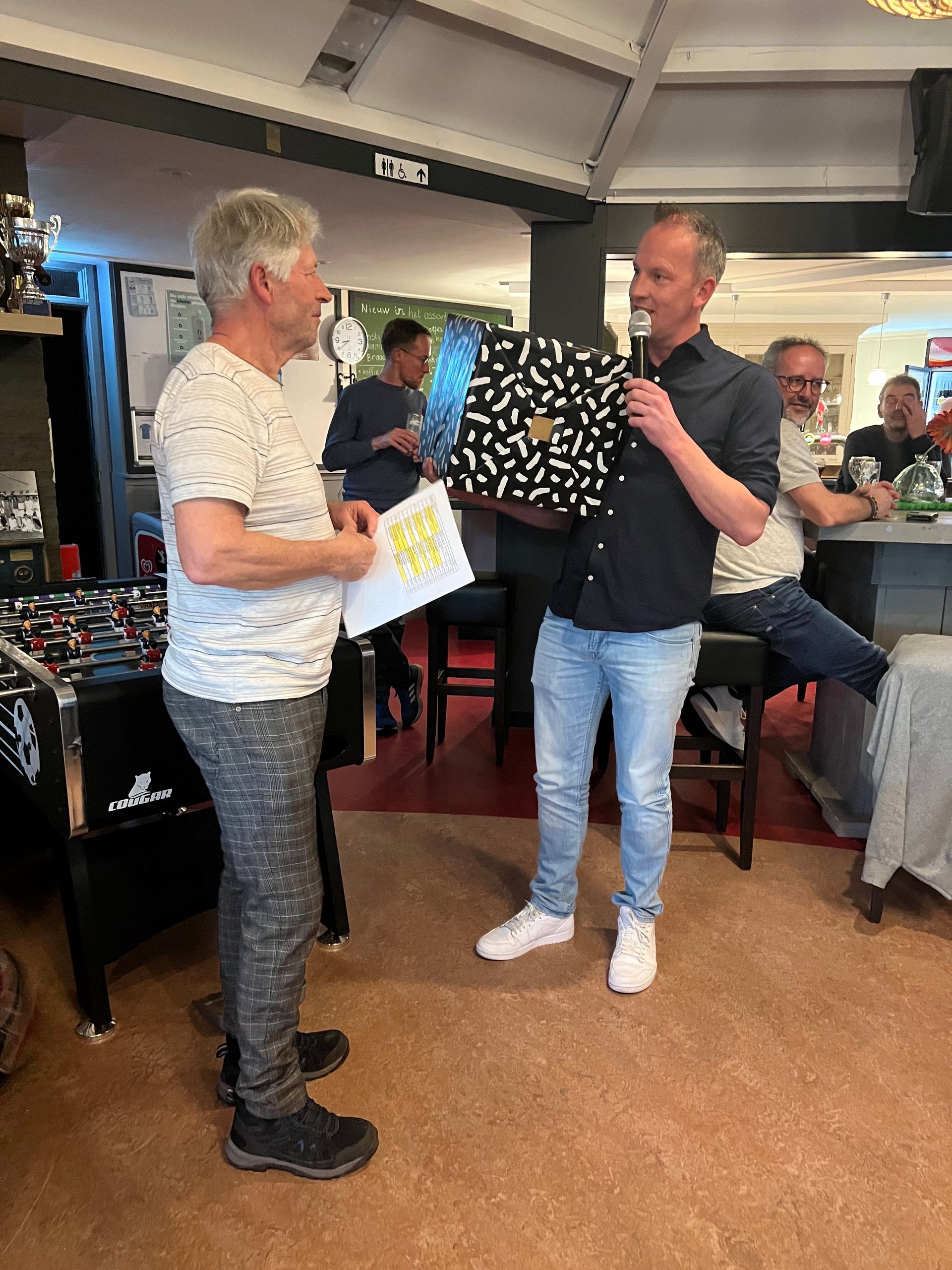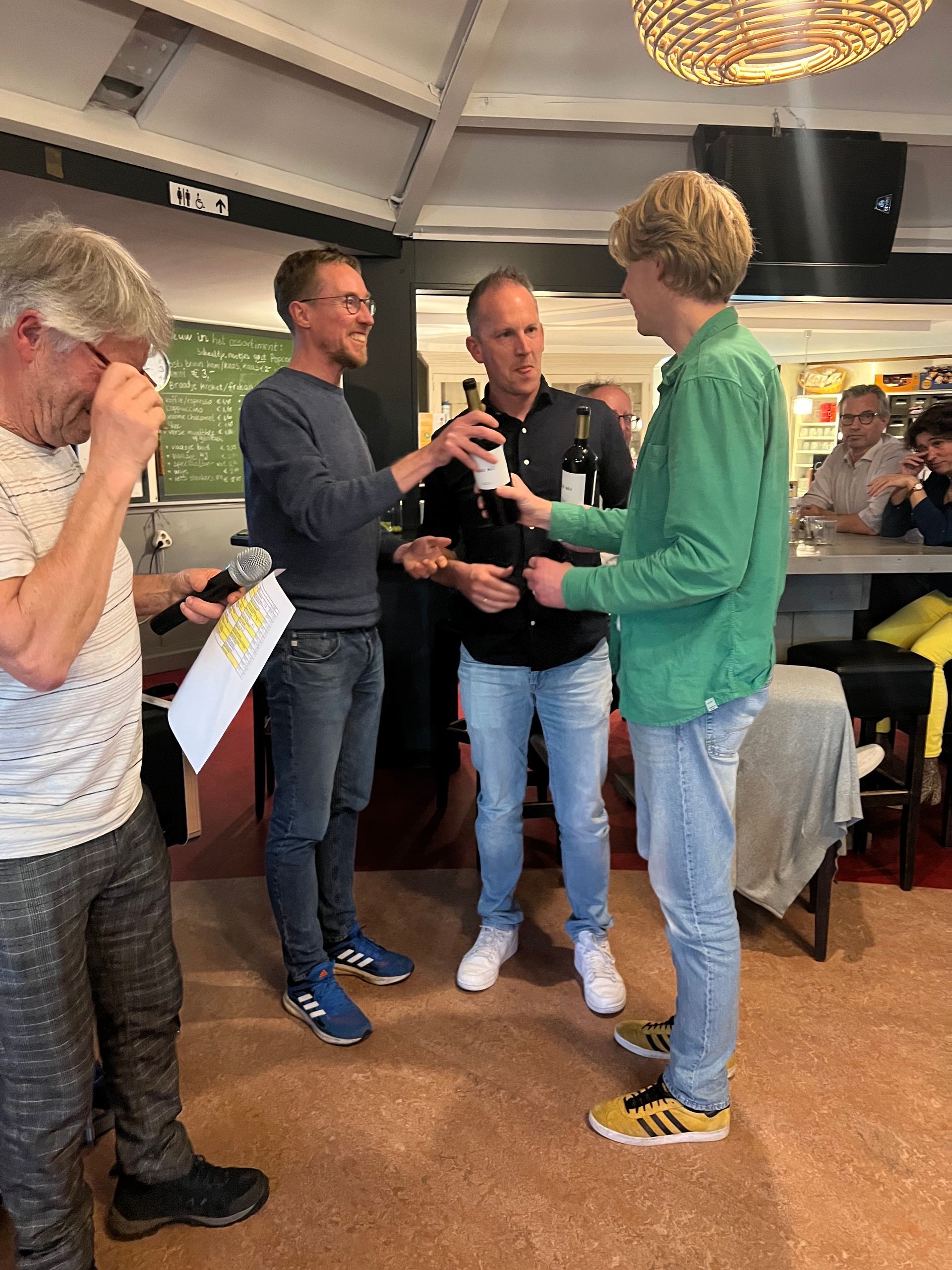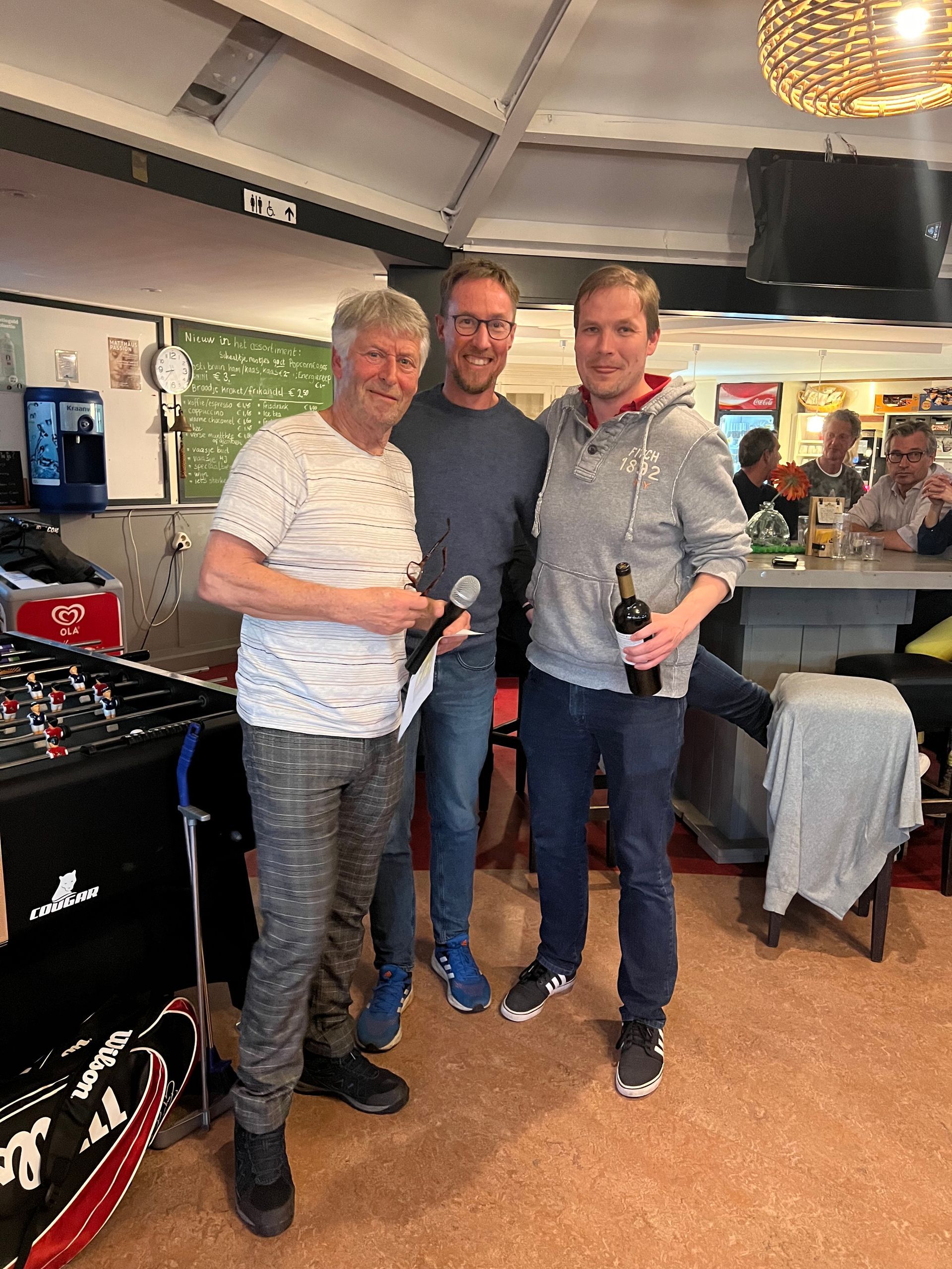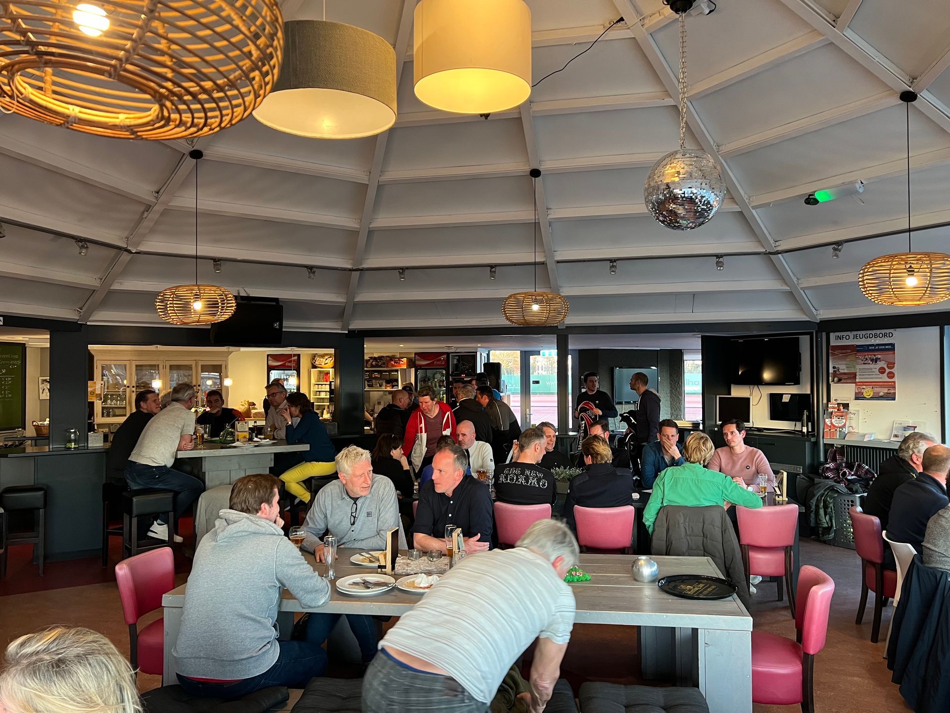 De ongedwongen sfeer op deze slotavond en de uitstekende Indonesische maaltijd is eveneens tekenend voor deze competitie, waar het clubgevoel een belangrijke rol speelt. Het was dan ook al tijdens de competitie merkbaar dat de nieuwe deelnemers voorgelicht werden door hun meer ervaren clubgenoten en zo voor een soepele voortgang zorg droegen. De afsluiting kende ook een prettige afloop voor de organisator. Hij werd toegezongen en was niet ongevoelig voor de vele schouderklopjes. Hij zal bovendien niet ongevoelig blijken voor de diverse tripeltjes, die hem als verrassing werden toebedeeld. Bovendien mocht hij een L.I.O. voorstellen aan de deelnemers. De laatste maakte zich direct nuttig op deze avond en er werd een afspraak gemaakt voor het nieuwe winterseizoen.