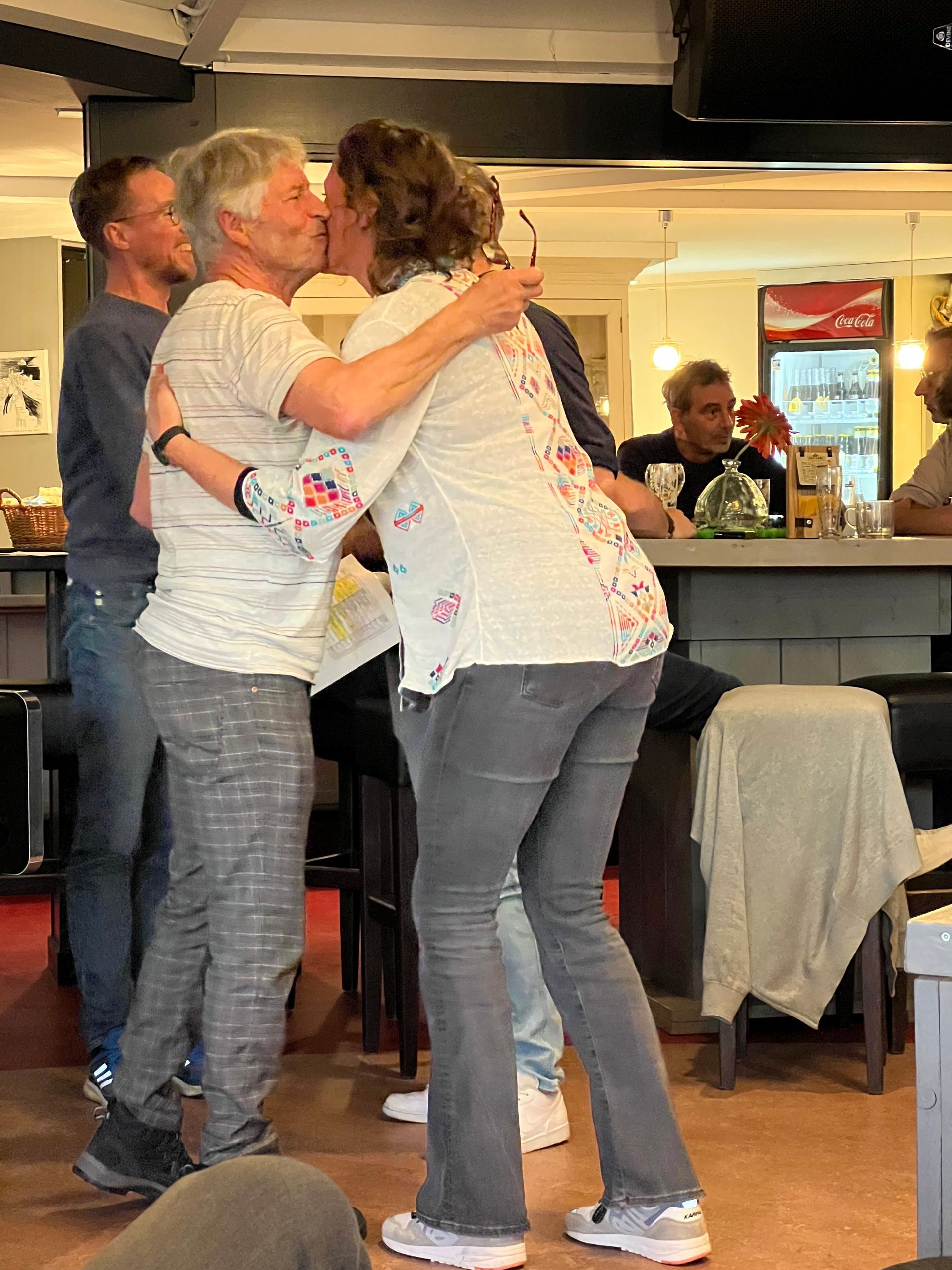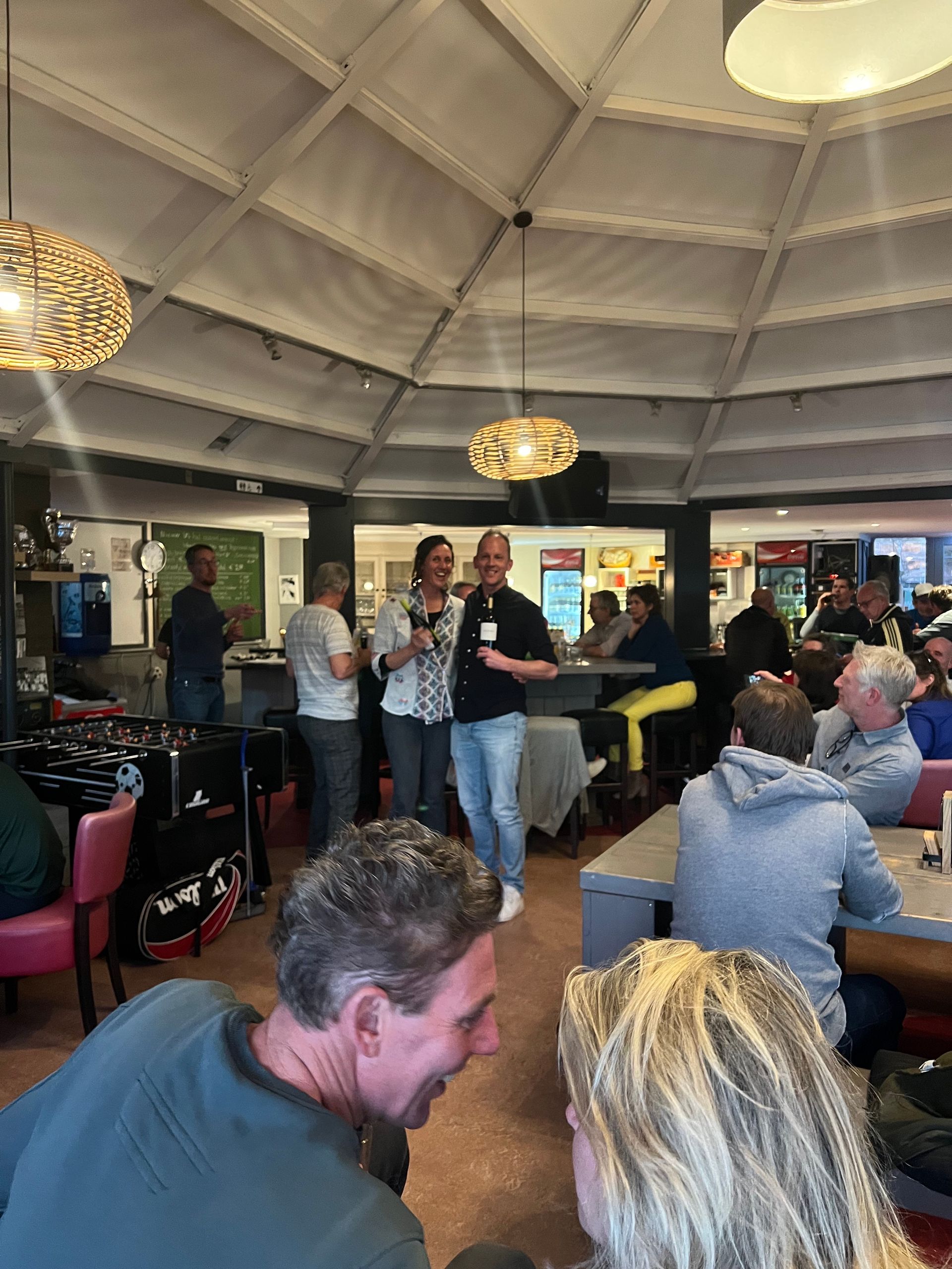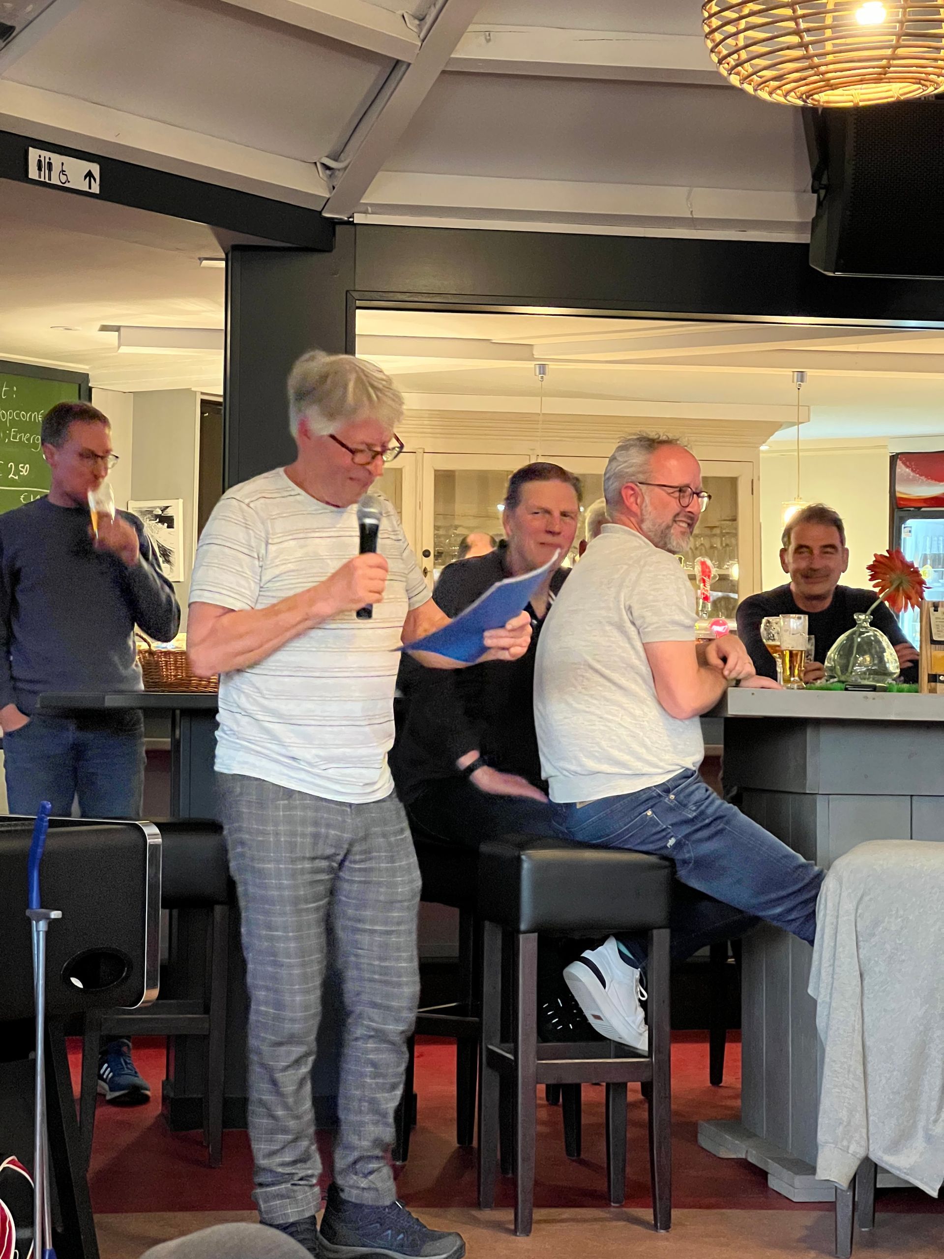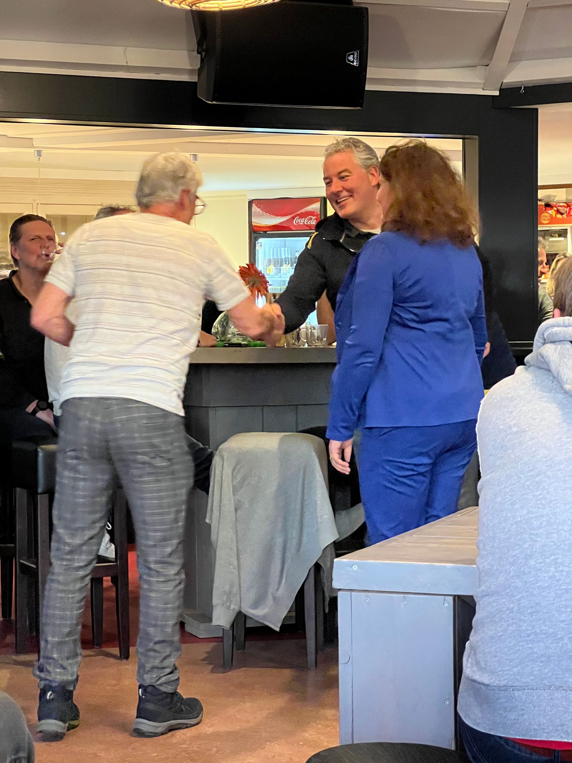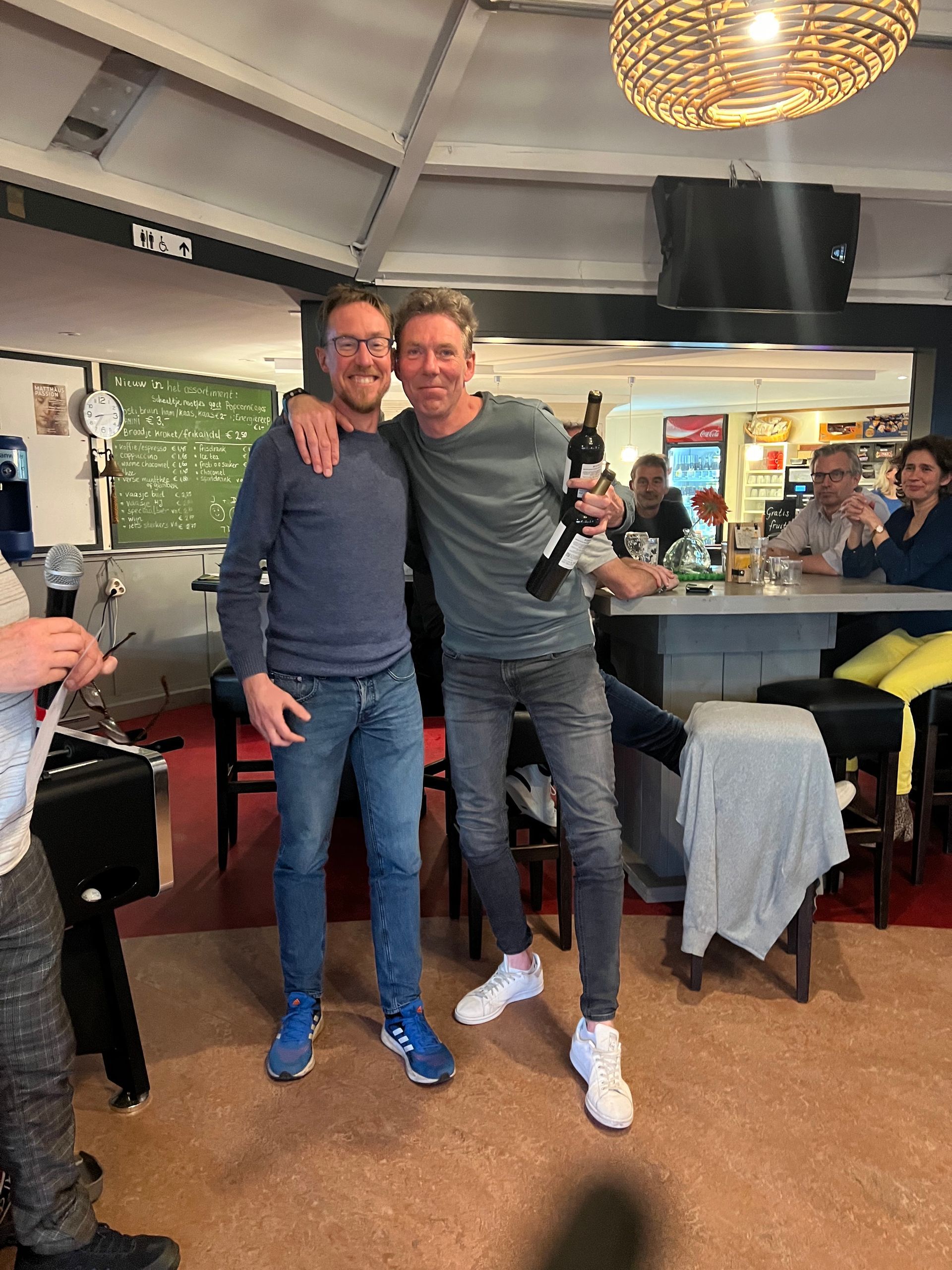 De ongedwongen sfeer op deze slotavond en de uitstekende Indonesische maaltijd is eveneens tekenend voor deze competitie, waar het clubgevoel een belangrijke rol speelt. Het was dan ook al tijdens de competitie merkbaar dat de nieuwe deelnemers voorgelicht werden door hun meer ervaren clubgenoten en zo voor een soepele voortgang zorg droegen. De afsluiting kende ook een prettige afloop voor de organisator. Hij werd toegezongen en was niet ongevoelig voor de vele schouderklopjes. Hij zal bovendien niet ongevoelig blijken voor de diverse tripeltjes, die hem als verrassing werden toebedeeld. Bovendien mocht hij een L.I.O. voorstellen aan de deelnemers. De laatste maakte zich direct nuttig op deze avond en er werd een afspraak gemaakt voor het nieuwe winterseizoen.
